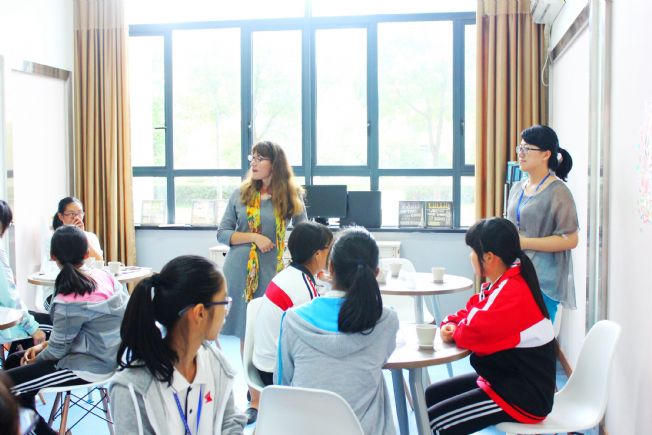 “礼行天下”的外教Sarah老师和任李静老师正和同学用英语热烈交流
