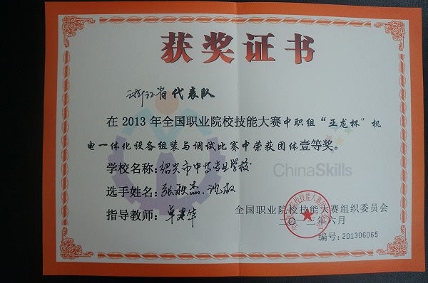 张秋杰、沈权同学荣获2013年全国职业院校技能大赛中职组机电一体化设备组装与调试比赛一等奖