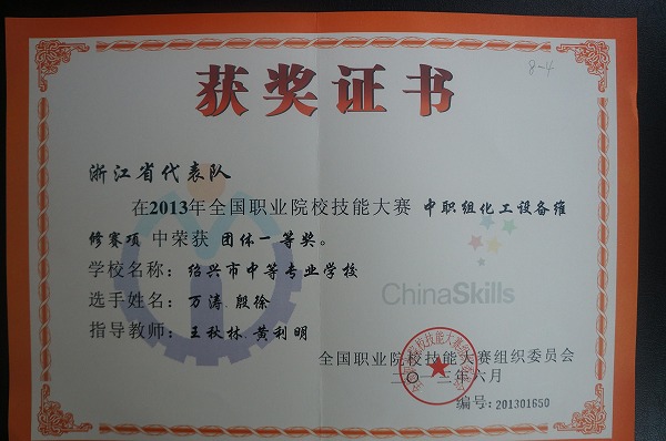 万涛、殷徐同学荣获2013年全国职业院校技能大赛中职组化工设备维修赛项一等奖