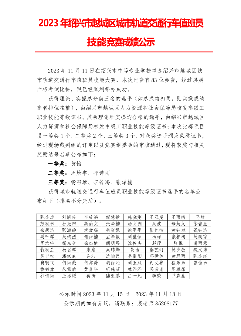 城市轨道交通行车值班员成绩公示