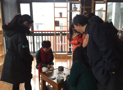 自从机械电气西南角的阅读吧布置好后,那片地方就热闹了起来。不仅木架上摆放了书本和花瓶,将这片角落装饰得赏心悦目,方便学生有空拿一本书看看,书架旁还摆上了两桌棋,更是吸引了很多学生前来切磋,有附近班级的同学,也有同学来自较远的班级。