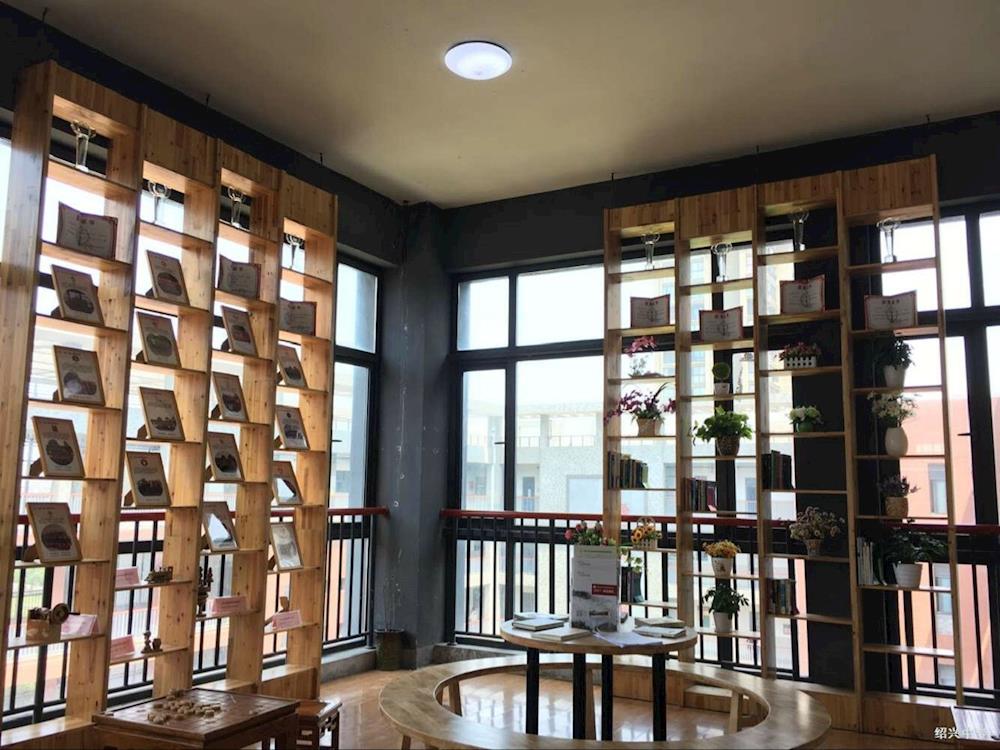 木制书架与桌椅呈现出素雅的气息,盆花为这个小小的角落增添了少许色彩。书架上与桌椅上整齐摆放着图书、奖牌与各班班徽。学生、老师甚至路过的家长都不禁驻足多看上几眼,时间允许的话也会小坐休息一下,随手拿出一本书翻翻,了解学校的人文、了解古今的文学或是了解修身养性之道。