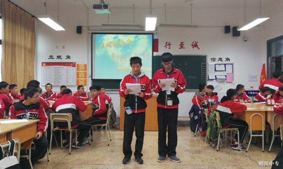 17 机电 4 班的两位才子还以节奏清晰、朗朗上口的自创 RAP ,将生活中常见的情景融入中专礼仪之歌。最后,全班宣誓:做举行得当,礼仪文明的中专生。