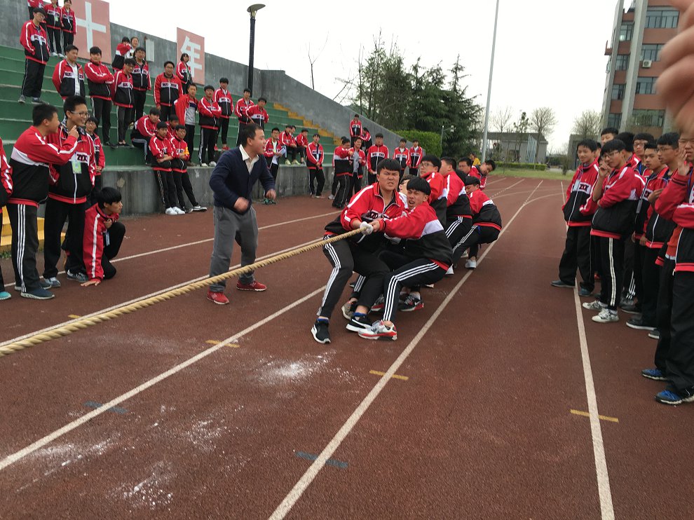 在班主任的带领下,清一色的男生队伍展现在我们面前,摩拳擦掌,跃跃欲试。随着比赛的哨声响起,一场力量之间较量就此展开。各班选手们按照原先商量好的作战技巧,双手紧握麻绳,以蹲坐之势身体微向后倾使重心后移,双方都用尽全力拉扯。他们不顾手掌与麻绳间摩擦的疼痛,一个个涨红了脸,用尽全身力量来赢得比赛。在外援老师的帮助下,赛情变得更加激烈,使场面常常陷入僵持状态,一时间难以分出胜负。最后在意志的较量下终于有了胜负结果。