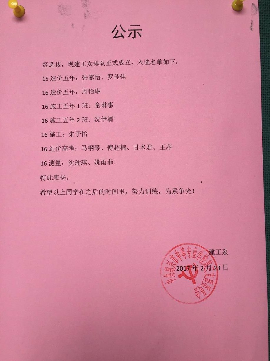 本次活动由钟秋、徐文两位体育老师负责选拔。选拔要求每人发5个球,看球的过网个数和发球动作给分。全体女生热情高涨,认真对待。最后选出了15造价五年班张露怡、16造价五年班周怡琳等12位女生,其中16造价高考班王萍担任队长。