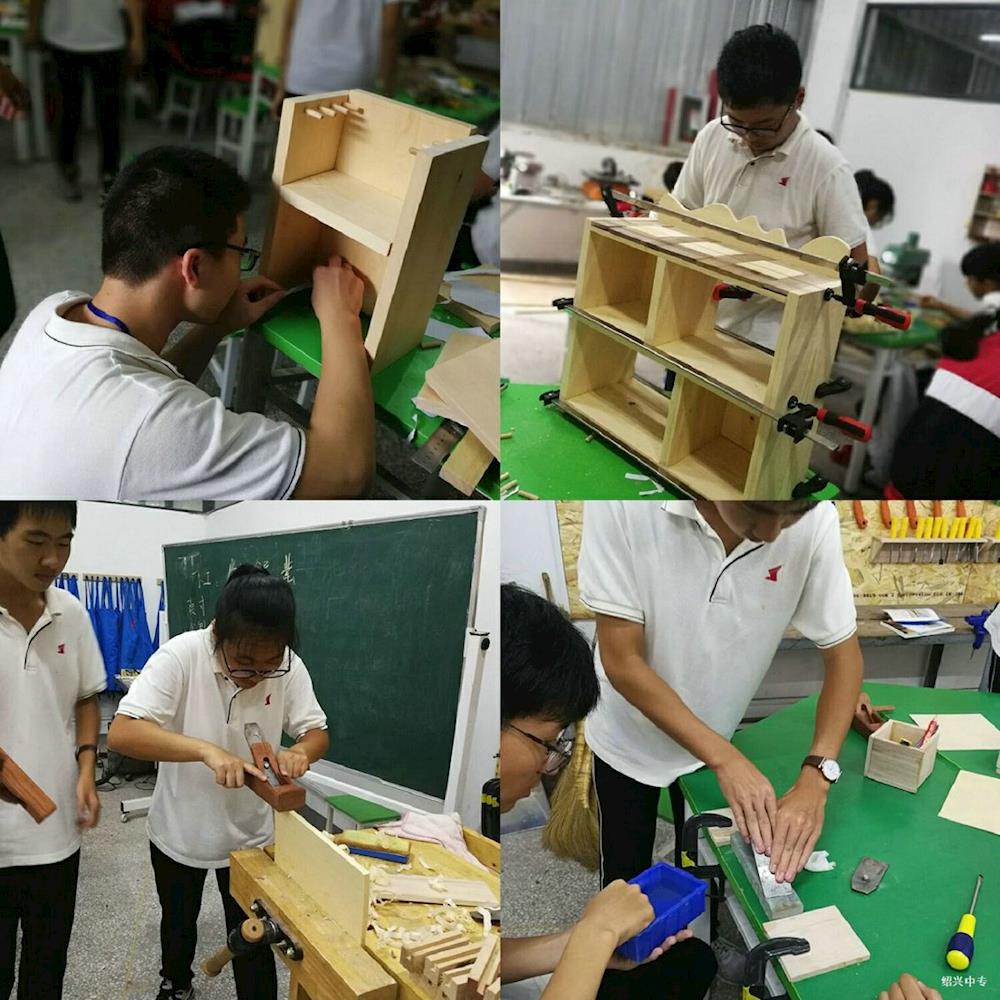 新生对木工的了解都相对甚少。第一节实训课开始,蔡菊琴老师会先对学生进行安全意识、安全常识、安全知识相关内容的讲解。之后是演示讲解主要工具、电动设备的功能、使用及危险点,并强调什么工具干什么活及正常的维护和收纳整理。良好的开始是实训项目成功的一半,并有效减少了工具对学生的伤害。经过安全操作培训,学生受伤情况明显减少,基本为“0”,而工具损坏率也降低了很多。每次项目制作之前,必定会经过设计、解构、技术分析三个环节,大大提高了学生制作的成功率,提高了学生制作的自信心。随着学习制作、使用工具的不断深入,学生有了越来越多的制作灵感。制作过程也是一个团队合作的过程,实行小组长制,经过分工,制作合理高效。每个项目成果都有学生进行作品设计制作展示说明,最后由学生进行评价打分,并计入最终考核。学生专业、严谨、创新的精神,使其成为一个合格鲁班人。