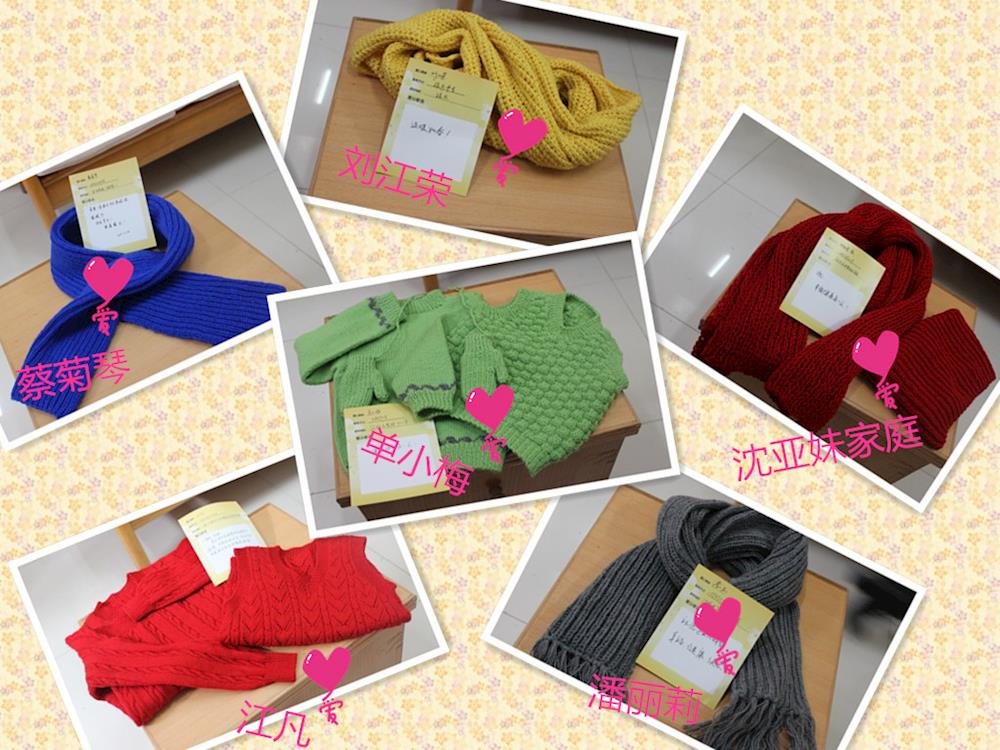 多方关心,汇聚温暖!活动过程中,我们的女教职工不但自己身体力行,更动员自己的亲属参加,扩大了此次爱心编织活动的范围,增强了此次爱心活动的影响。此次活动一共发放毛线20余斤,共收回各色花样毛衣裤15件,围巾18条,帽子3顶,手套3副。