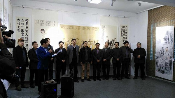 在随后召开的研讨会上,与会人士纷纷发言,共同探讨戏曲人物画的创作艺术和越剧大师的唱腔特点。钱伟平副会长代表主办方首先发言,充分肯定了陈蔚南对书画艺术的执着追求和取得的阶段性的成果。周一农教授、汪嘉宝先生、路键群先生、蔡人灏主任、诗人袁志鹏等先后发言,充分肯定了陈蔚南老师的越剧题材作品,赞赏陈老师既能用工细的笔触表现人物、又能用豪放的笔法来创作。周一农教授尤其从陈老师其他几幅作品如《临吴山明先生藏民图》、《兰亭雅集图》等谈到了陈老师的画风在渐渐向文人画转换,迈出了从“雅俗共赏”向“古厚雅逸”转型的第一步,可喜可贺。汪嘉宝先生谈到上世纪90年代初曾教过陈蔚南越剧、平湖调、琵琶等,也谈到曾在绍兴电视台名牌栏目《兰花艺苑》中专门介绍过陈蔚南,题为《琴戏书画·戏剧人生陈蔚南》,琴——陈蔚南会琵琶、古琴;戏——陈蔚南会越剧、沪剧、黄梅戏;书·画——是他的专业,自小跟商敬诚先生学画,后从事美术教育工作,今天欣喜地看到,陈老师把以往对戏曲的喜爱融入到笔端,用两年半的时间画出了“越剧名家系列作品”,十分难得,在当今商品经济大潮的大环境下陈蔚南不随波逐流,能够静下心来收集整理越剧名家事迹、图片等,在吴山明、池沙鸿等导师的指导下集中创作了此类作品,精神可嘉,实乃大雅之作。最后路键群先生谈到陈蔚南是绍兴美术界的创作骨干,曾看到过他创作的《绍兴老街系列作品》等作品在博物馆展出,去年4月23日绍兴市委宣传部在浙江美术馆举办的《人文绍兴·主题性大型展览》中,也看到了他创作的《越剧十姐妹》展出,真是可喜可贺。