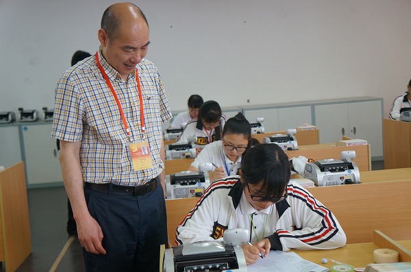 邵国成校长正在仔细了解学生参加原始凭证填制竞赛的情况