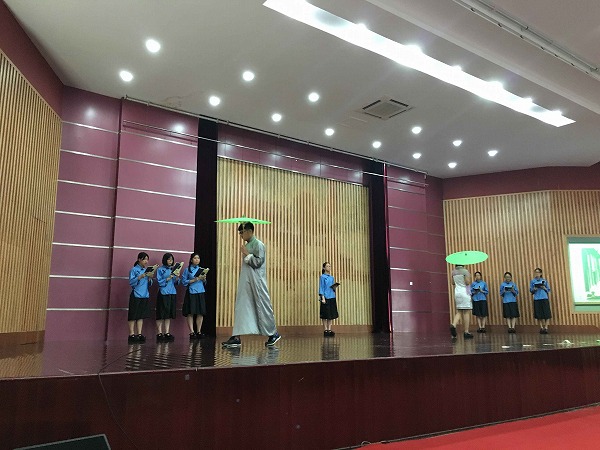 参赛同学正在台上朗诵戴望舒的《雨巷》