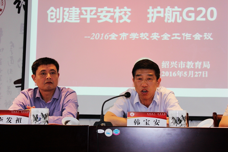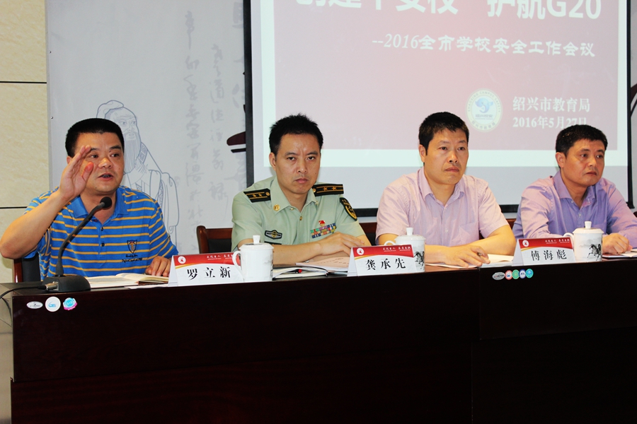 2016年5月27日,市教育局在绍兴中专组织召开了2016年全市学校安全工作会议。本次会议以“创建平安校,护航G20”为主题,旨在进一步规范全市学校安全管理,深入推进“平安校园”建设,贯彻落实上级各部门对G20峰会安保要求。本次会议由绍兴市教育局安监处罗立新处长主持,教育局副局级党委委员李发祖出席会议并作了重要讲话。政法委平安办、人防、安监、公安、消防等有关部门领导,各区、县(市)教育局安全工作分管局长、安监科科长,各在绍高校安全工作分管领导、保卫处处长, 各市直学校校长、安全工作分管校长和市教育局相关处室的负责人、2015年度市级“平安校园”校(园)长共计140人左右参加了本次会议。