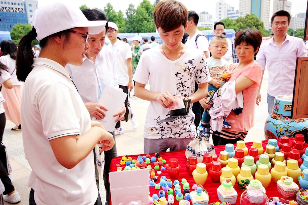 在2016年全市职教成果展上市民争相购买潘老师师生作品