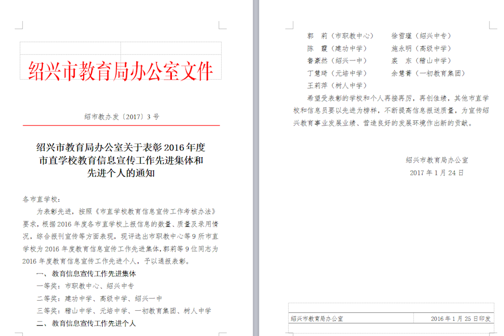 2016年,在办公室牵头下,通过全校教职工,特别是各处室、系信息员的努力,学校在绍兴晚报、绍兴教育网、浙江职成教网、绍兴工会网等媒体报道达157篇,在校园网发布学校大赢家官网350余篇,有效推广了学校的办学成果,提升了学校的知名度与美誉度。出色的工作得到了市教育局的充分肯定,在2016年度的教育信息宣传考核中,学校获得教育信息宣传工作一等奖,学校被评为2016年度教育信息宣传工作先进集体,徐雪瑾老师被评为教育信息宣传先进个人。