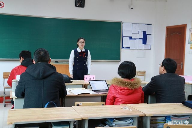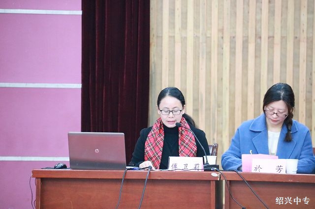 绍兴市中职语文大组副组长傅卫莉主持会议(左一)